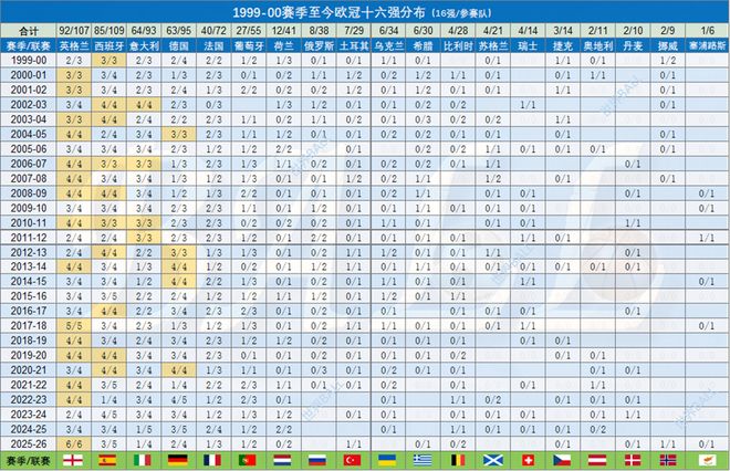 为什么要从1999-00赛季开始?这并非偷懒,只统计了本世纪的数据,而是在1998-99赛季以前,各国参加欧冠的球队数量远不如今天这么多,位于食物链顶端的英、西、意等强国的联赛亚军有资格参赛,也不过是从1997-98赛季才有的事情。